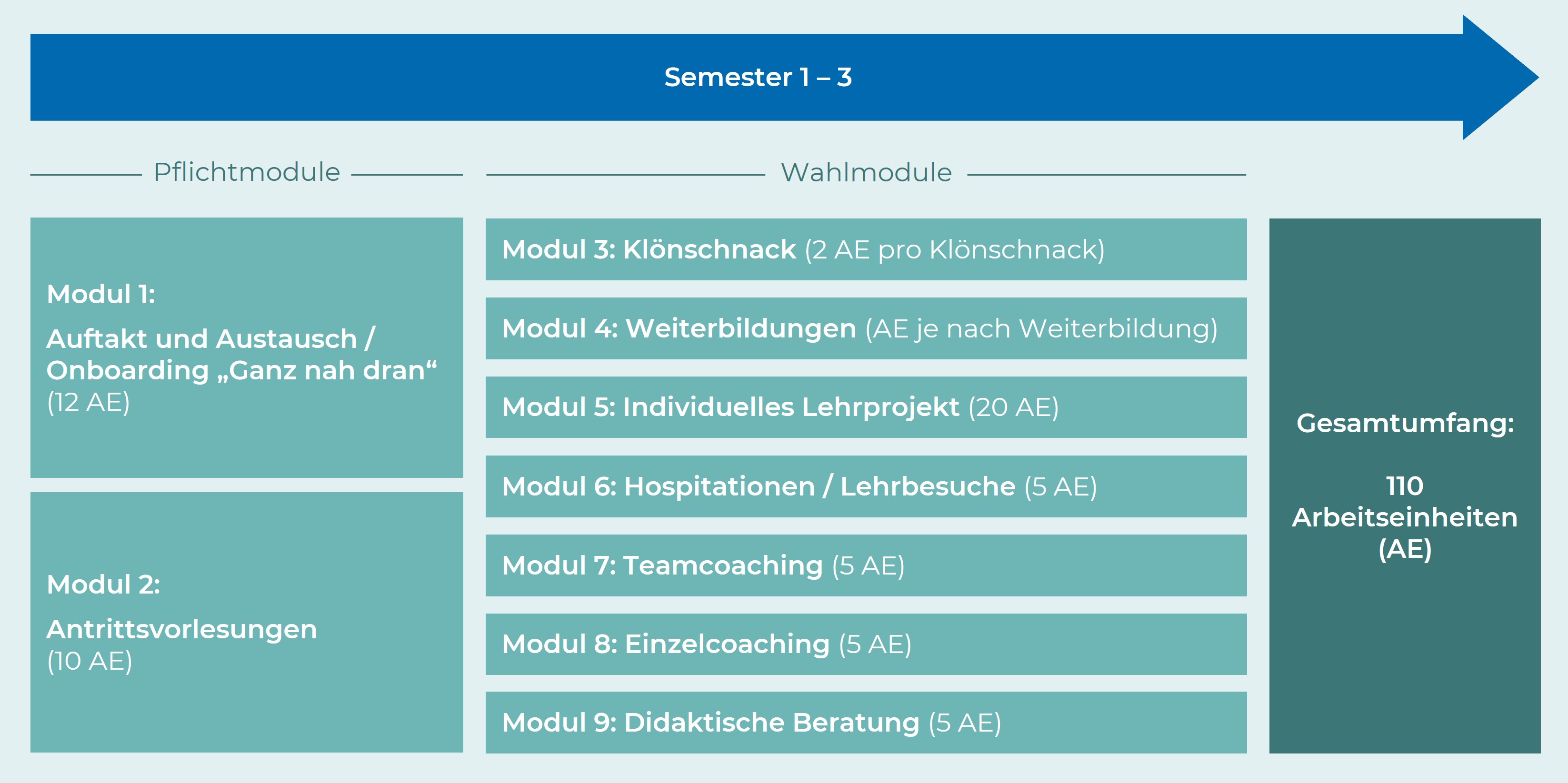 Im Verlauf von ca. drei Semestern setzt sich das Programm aus unterschiedlichen Modulen mit einem Umfang von insgesamt 110 Arbeitseinheiten (AE, 1 AE entspricht 45 Minuten) zusammen. Die Auftaktveranstaltung sowie die Austauschformate (12 AE) und die Antrittsvorlesungen sind als Pflichtmodule vorgesehen, die weiteren Angebote und deren Umfang können individuell gewählt werden. Für die didaktische Weiterentwicklung einer oder mehrerer Lehrveranstaltungen im Lehrprojekt ist es möglich, diese Veranstaltung(en) mit der doppelten Anzahl an Lehrveranstaltungsstunden geltend zu machen. (Die Voraussetzungen hierfür sind im Detail unter "Interne Organisation und formale Regelungen" [siehe unten] aufgeführt.)
