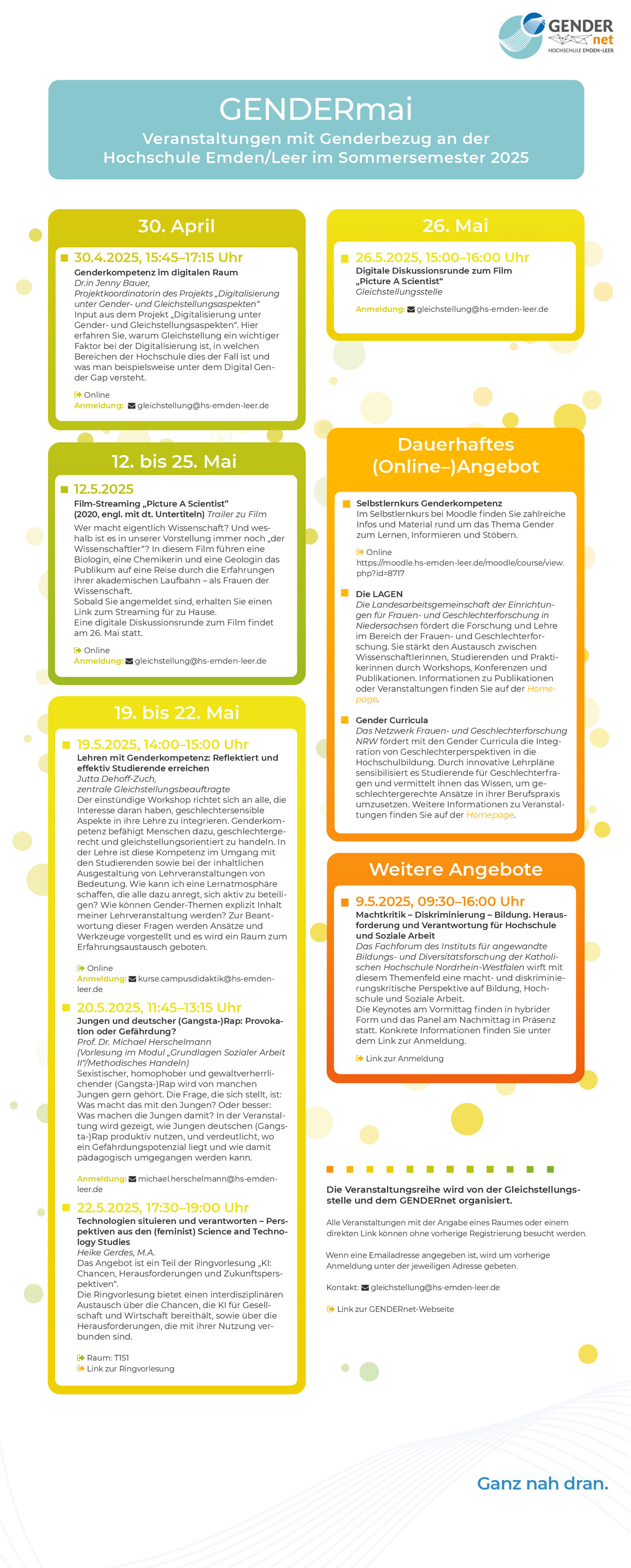 Genderaspekte tauchen an der Hochschule in vielen Kontexten auf, denn überall, wo Menschen zusammenkommen, spielen unsere Vorstellungen von Geschlecht und geschlechtsspezifischen Verhaltensweisen eine Rolle. Für den GENDERmai 2025 haben wir Veranstaltungen an der Hochschule Emden/Leer zusammengetragen, die sich aus unterschiedlichen Perspektiven mit dem Themenbereich Gender beschäftigen.