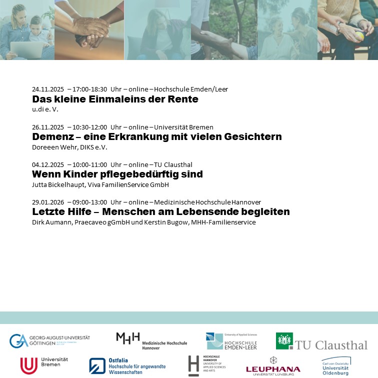 Da die Teilnehmendenzahl begrenzt ist, wird um vorherige Anmeldung per Mail an familienservice(at)hs-emden-leer.de gebeten. Die Links zu den virtuellen Veranstaltungsräumen werden nach der Anmeldung verschickt.