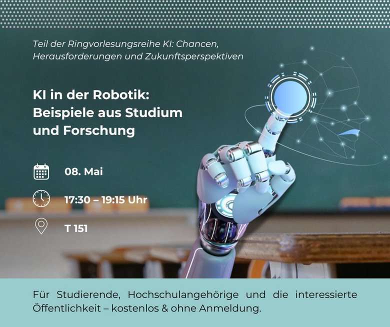 In modernen Robotersystemen ist die Anwendung von KI fast Pflicht. KI bietet Möglichkeiten zur Identifizierung von Bauteilen, zur Hilfe bei der Grießpositionserkennung, zur Erlernung komplexer Bewegungen bei mobilen Robotern und zur Sprachsteuerung über große Sprachmodelle. In diesem Vortrag werden die Entwicklungen verschiedener Projekte an der Hochschule vorgestellt und Trends aus der Forschung und Industrie gezeigt, die einen Blick in die Zukunft bieten.