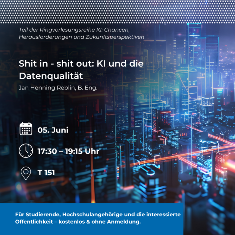 Die Hochschule Emden/Leer lädt zu einem weiteren Vortrag innerhalb ihrer öffentlichen Ringvorlesung zum Thema „KI: Chancen, Herausforderungen und Zukunftsperspektiven“ ein. Am Donnerstag, 05. Juni, spricht Jan Henning Reblin ab 17.30 Uhr zum Thema „Shit in - shit out: KI und die Datenqualität“.