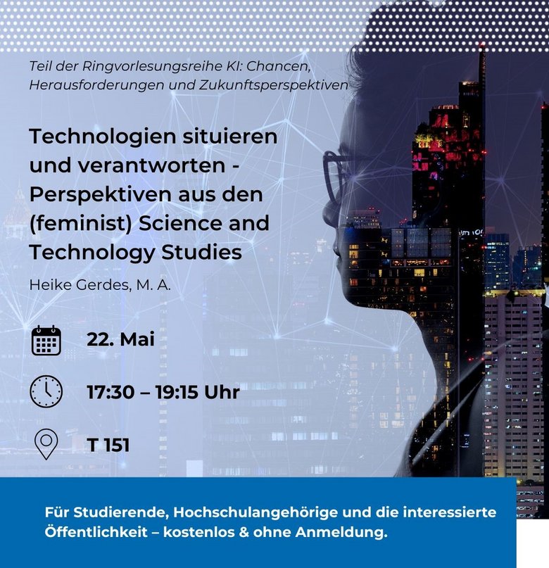 Die Hochschule Emden/Leer lädt zu einem weiteren Vortrag innerhalb ihrer öffentlichen Ringvorlesung zum Thema „KI: Chancen, Herausforderungen und Zukunftsperspektiven“ ein. Am Donnerstag, 22. Mai, spricht Referentin Heike Gerdes vom Fachbereich Soziale Arbeit und Gesundheit ab 17.30 Uhr zum Thema „Technologien situieren und verantworten - Perspektiven aus den (feminist) Science and Technology Studies“.