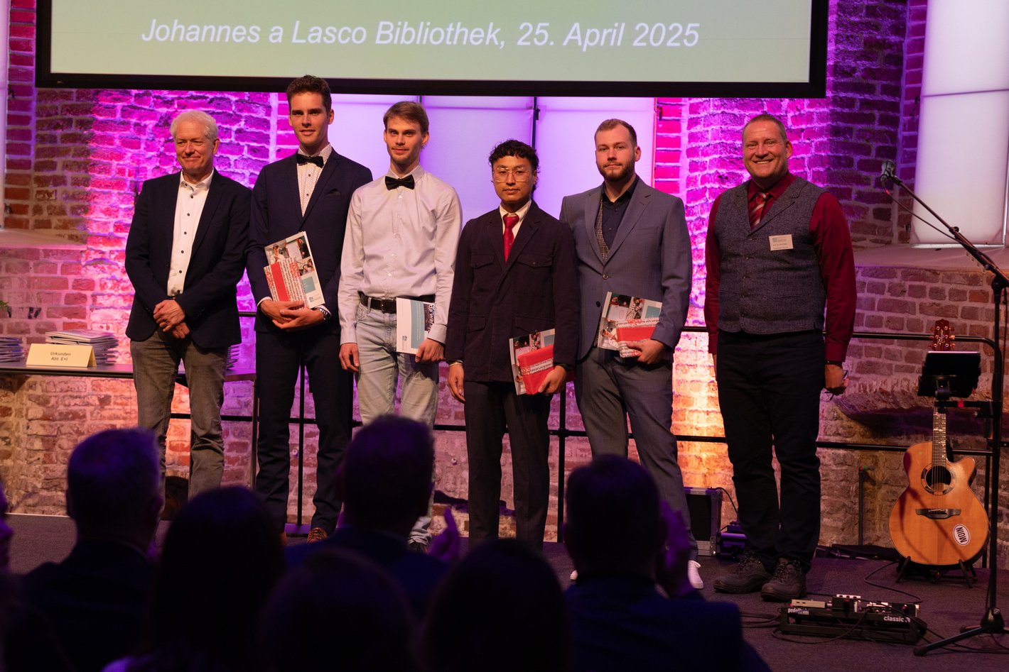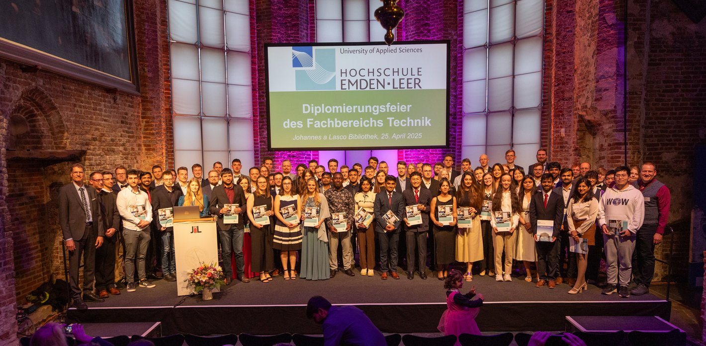 Mit rund 350 Gästen feierte der Fachbereich Technik der Hochschule Emden/Leer am vergangenen Freitag (25. April) seine Bachelor- und Master-Absolventinnen des letzten halben Jahres. Auf Einladung des Dekans, Prof. Dr. Dirk Rabe, genossen 77 von ihnen ihre persönliche Ehrung auf der Bühne der Johannes a Lasco-Bibliothek inklusive Photosession und viele herzliche Glückwünsche. Im stimmungsvollen Programm verdeutlichten die Redner ihnen und ihren Angehörigen, Mitgliedern der Hochschule und externen Gästen die besondere Bedeutung dieses persönlichen Meilensteins und die hieraus resultierende Verantwortung für den weiteren Lebensweg. Die drei Studiendekane Prof. Dr. Johann-Markus Batke, Prof. Dr. Jens Hüppmeier und Prof. Dr. Thomas Schüning freuten sich gemeinsam mit Dekan Rabe, persönlich die Glückwunsch-Urkunden überreichen zu können.
