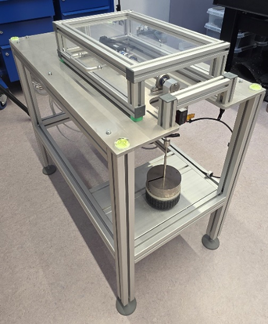 Tribologische Untersuchungen werden auf einem eigens entwickelten Prüfstand durchgeführt, der speziell auf die Geometrie von Gleithülsen abgestimmt ist. Das Prüfsystem basiert auf dem Verfahren C2 gemäß DIN ISO 7148-2. Die Gleithülsen sind in einer Pendelvorrichtung montiert und werden einseitig durch eine motorgetriebene Welle abgestützt. Die Belastung erfolgt über definierte Prüfgewichte (0,5 kg / 1,0 kg / 2,0 kg), die über die Pendelmechanik auf die Prüfkörper übertragen werden. Die Reibungserfassung erfolgt berührungslos durch einen Lasersensor, der die horizontale Auslenkung des Pendelarms misst. Auf Basis dieser Messung wird der Reibkoeffizient berechnet.