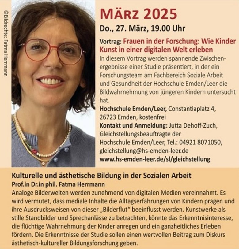 Seitens der Hochschule Emden/Leer wird ein Forschungsprojekt am Fachbereich Soziale Arbeit und Gesundheit vorgestellt. Am Donnerstag, 27. März, referiert die Professorin Fatma Herrmann zum Thema „Frauen in der Forschung: Wie Kinder Kunst in einer digitalen Welt erleben“ und rückt damit die Bildwahrnehmung von Vier- und Fünfjährigen ins Zentrum. Mit dem Thema hat sich seit 2022 ein Forschungsteam im Projekt EBBiK (Entwicklung von Bildfähigkeit als Bildungsauftrag in der Kindheitspädagogik) beschäftigt. Für die Studie wurden Gruppendiskussionen und Bildgespräche mit Kindern in Berliner und Emder Kitas durchgeführt. Untersucht wurde dabei, wie analoge Kunstbilder die Kinder zu vielfältigen Erzähl- und Ausdrucksweisen anregen können. Prof.in Dr.in Fatma Herrmann präsentiert in ihrem Vortrag spannende Ergebnisse dieser Studie.