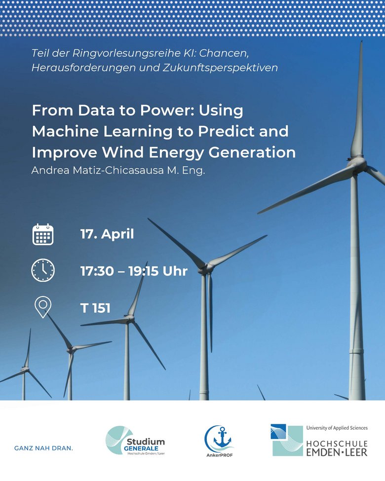 Die Hochschule Emden/Leer lädt zu einem weiteren Vortrag innerhalb ihrer öffentlichen Ringvorlesung zum Thema „KI: Chancen, Herausforderungen und Zukunftsperspektiven“ ein. Am Donnerstag, 17. April, spricht Referentin Andrea Matiz-Chicasausa vom Fachbereich Technik ab 17.30 Uhr zum Thema „From Data to Power: Using Machine Learning to Predict and Improve Wind Energy Generation“. Der Vortrag ist in englischer Sprache.