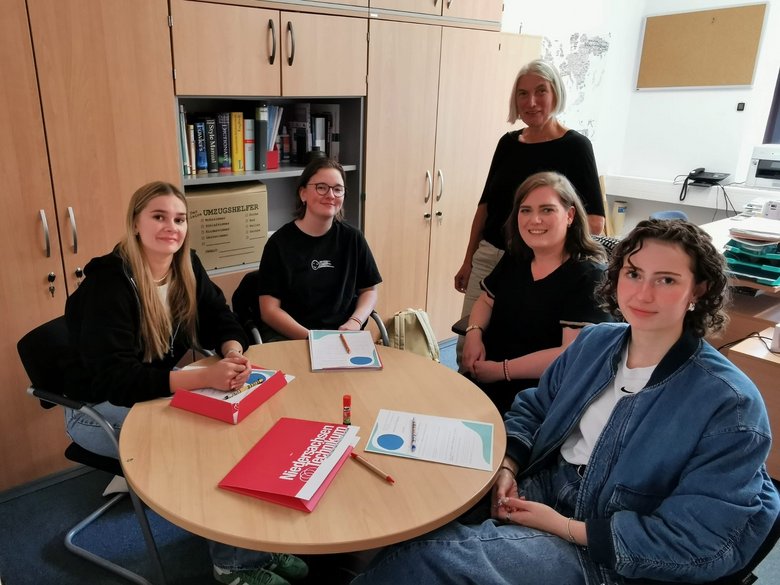 Erster Tag an der Hochschule (v.l.): Die Technikantinnen Lea Schwarz und Lea Schmies, Jutta Dehoff-Zuch, Zentrale Gleichstellungsbeauftragte der Hochschule Emden/Leer, Pauline Elenberger, Koordinatorin des Niedersachsen-Technikums an der Hochschule und Technikantin Charlotte Dreesman.