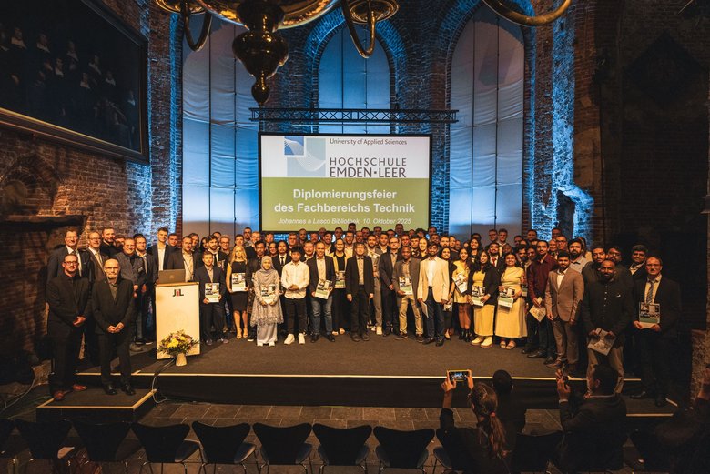Am vergangenen Freitag (10.10.) feierte der Fachbereich Technik der Hochschule Emden/Leer mit fast 400 Gästen die Bachelor- und Master-Absolventinnen und -absolventen des vergangenen halben Jahres. 89 der insgesamt 138 akademischen MINT-Nachwuchskräfte konnten die Einladung des Dekans, Prof. Dr. Dirk Rabe, annehmen und mit ihren stolzen Angehörigen, Hochschulmitgliedern und Ehrengästen den festlichen Abschluss ihrer Studienzeit genießen. Der besondere Moment war neben den Festreden die persönliche Auszeichnung auf großer Bühne und bot jede Menge Möglichkeiten für Erinnerungsbilder.