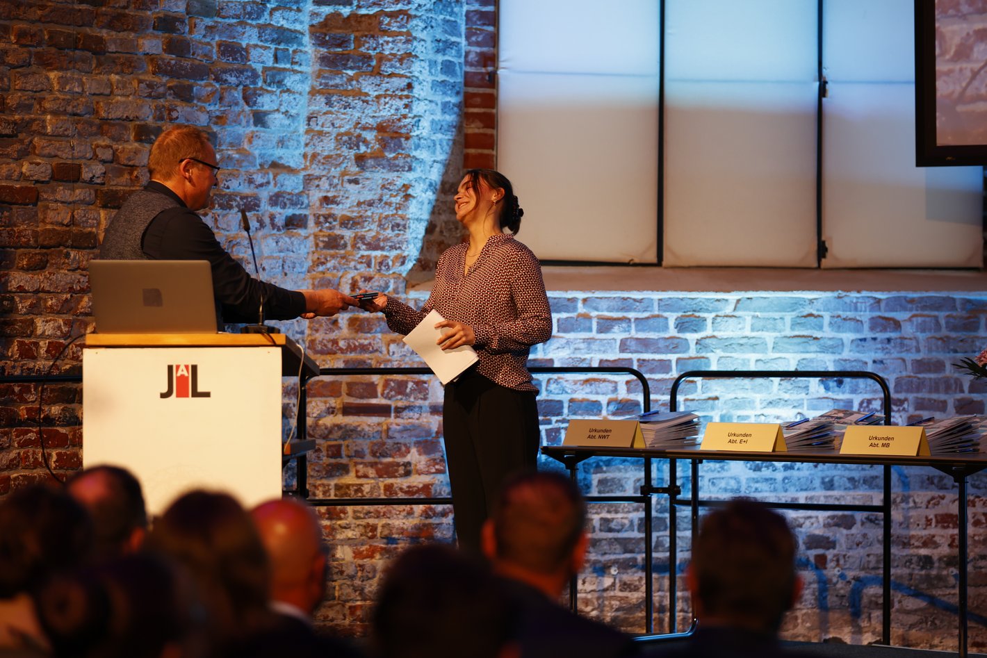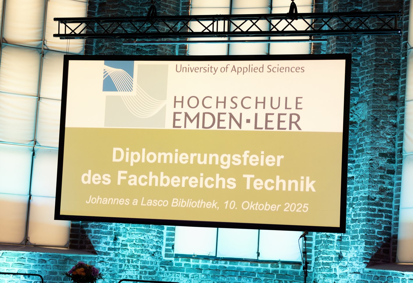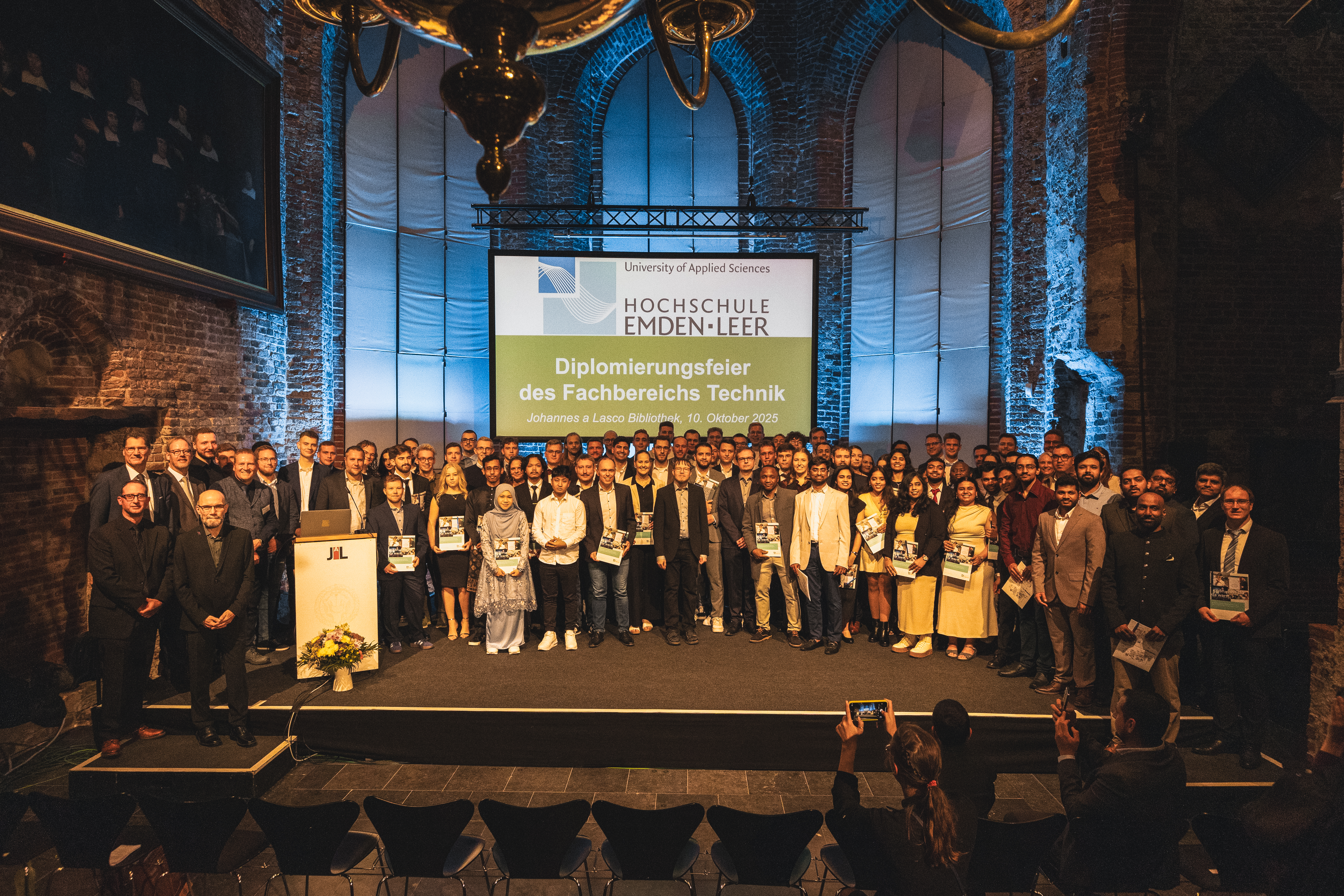 Am vergangenen Freitag (10.10.) feierte der Fachbereich Technik der Hochschule Emden/Leer mit fast 400 Gästen die Bachelor- und Master-Absolvent_innen des letzten halben Jahres. 89 der insgesamt 138 frischen akademischen MINT-Nachwuchskräfte konnten die Einladung des Dekans, Prof. Dr. Dirk Rabe, annehmen und mit ihren stolzen Angehörigen, Hochschulmitgliedern und Ehrengästen einen festlichen Abschluss ihrer Studienzeit genießen. Der besondere Moment war neben den Festreden die persönliche Auszeichnung auf großer Bühne und bot jede Menge Möglichkeiten für Erinnerungsbilder.