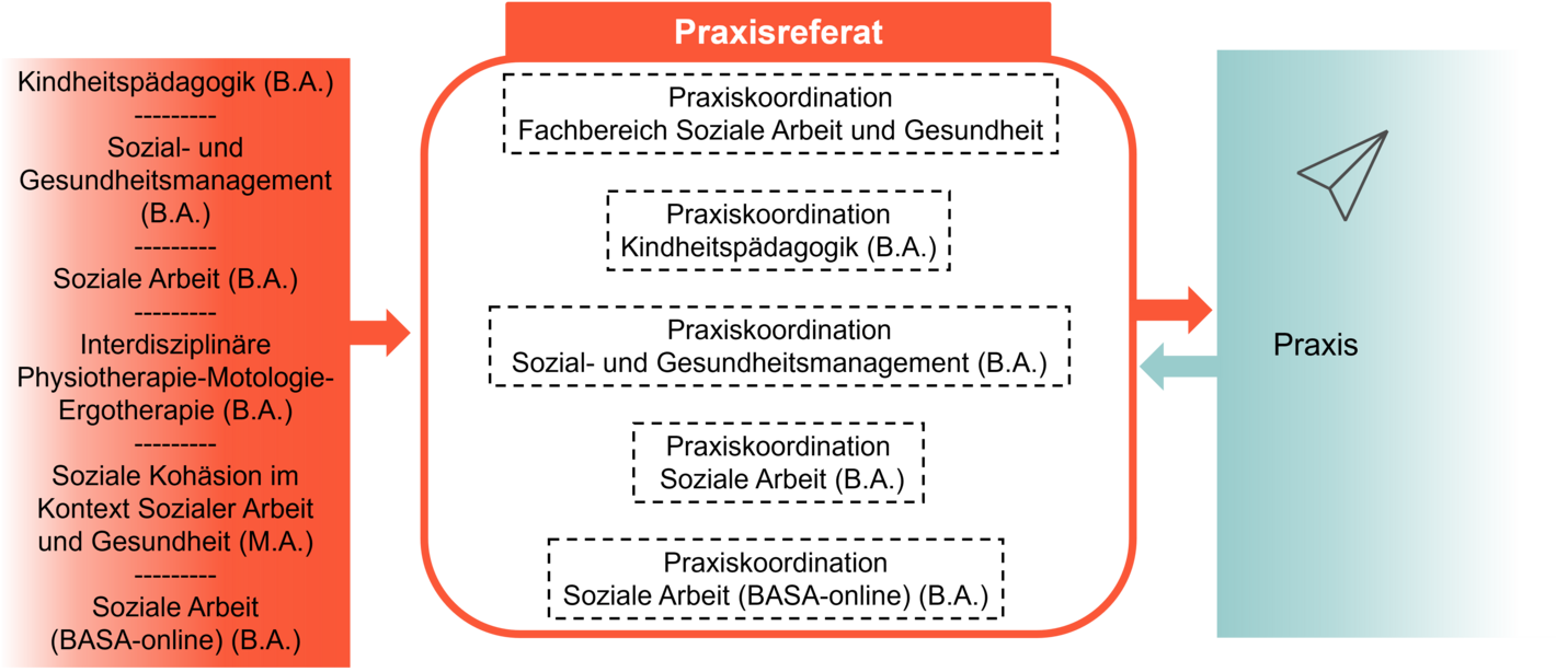 Zu dem Praxisreferat gehören alle fachlich zuständigen Mitarbeiter*innen aus den Studiengängen und dem Fachbereich, die mit Praxis(phasen)koordination zu tun haben. Organisatorisch ist das Referat in fünf verschiedene Koordinationsstellen - eine studiengangsübergreifende Koordinationsstelle für den gesamten Fachbereich sowie vier studiengangsspezifische Koordinationsstellen - untergliedert: