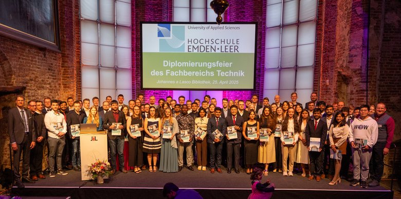 Mit rund 350 Gästen hat der Fachbereich Technik der Hochschule Emden/Leer am vergangenen Freitag (25. April) seine Bachelor- und Master-Absolventinnen und –absolventen des vergangenen halben Jahres gefeiert. Auf Einladung des Dekans, Prof. Dr. Dirk Rabe, genossen 77 von ihnen ihre persönliche Ehrung auf der Bühne der Emder Johannes a Lasco-Bibliothek.