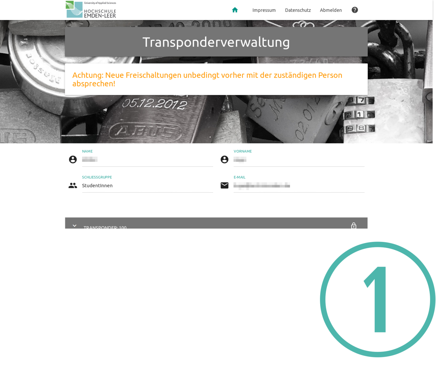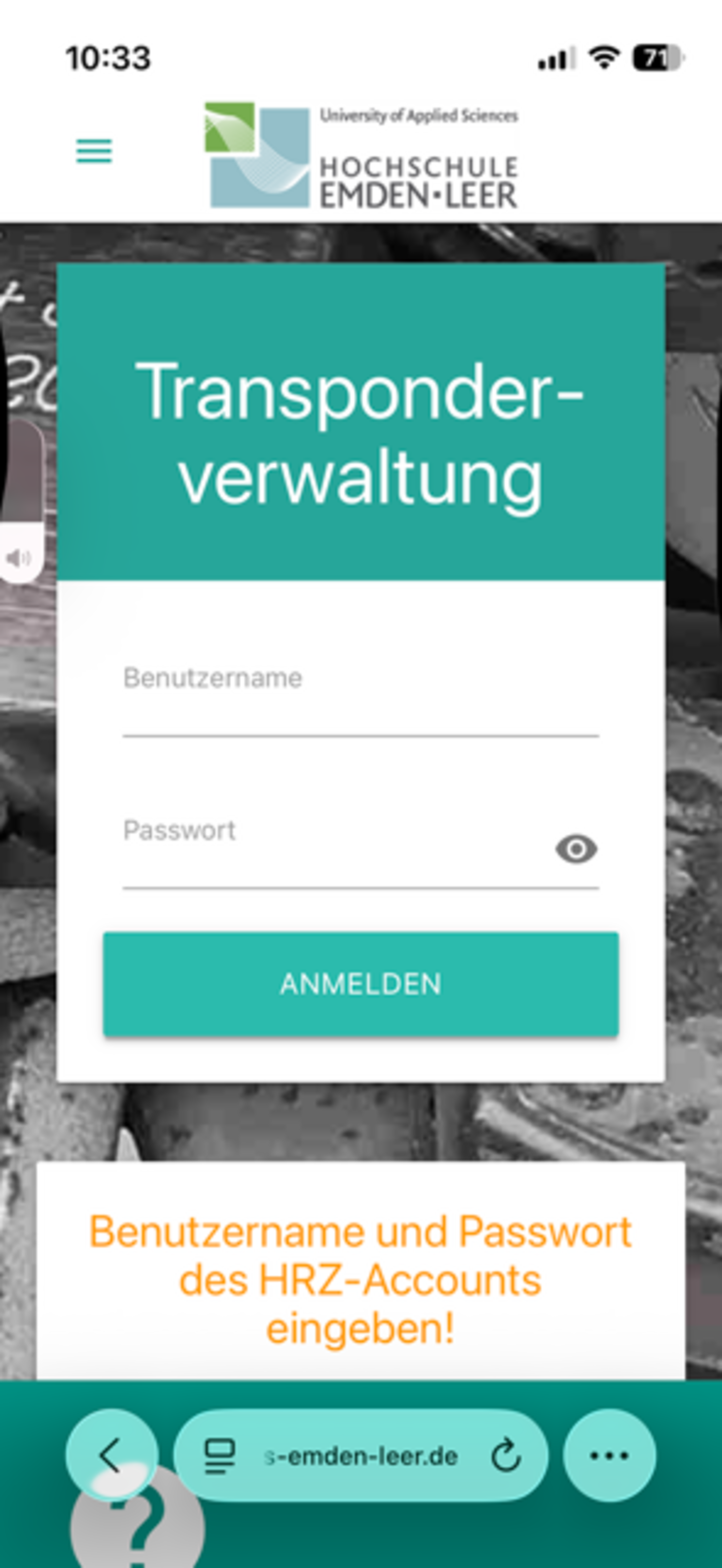Die Transponderverwaltung finden Sie auf der Seite https://transponder.hs-emden-leer.de/Transponder/. Für die Anmeldung nutzen Sie Ihren HRZ-Account, der mit Ihrem Transponder verknüpft sein muss.