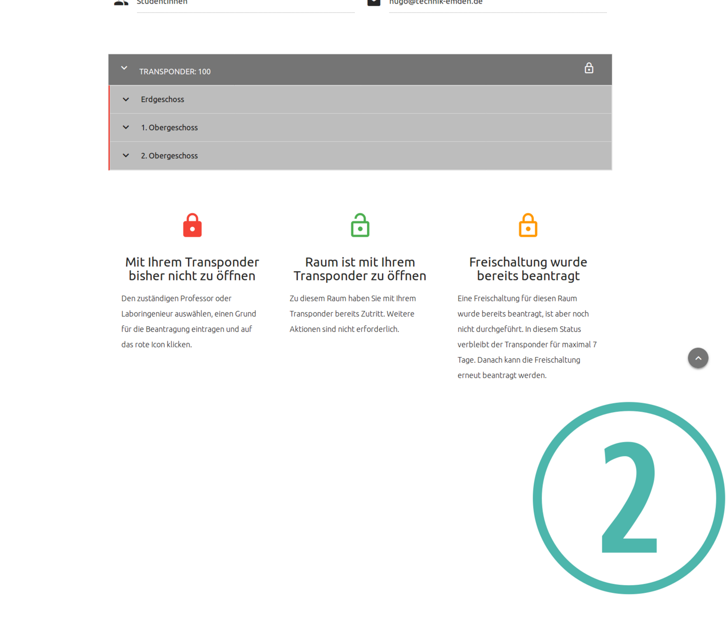 Im mittleren Bereich der Seite sehen Sie Ihre Transpondernummer und die mit dem Transpondersystem verbundenen Türen im Gebäude. Die Türen sind nach Etagen geordnet und werden nach einem Klick auf die jeweilige Etage angezeigt [2].