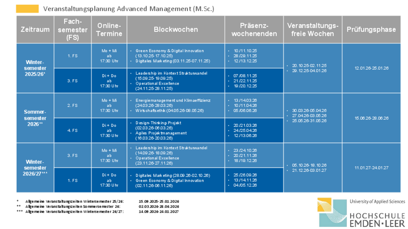 - Veranstaltungsfreie Wochen: Unter Berücksichtigung von Schulferien und Feiertagen gibt es pro Semester insgesamt 3 veranstaltungsfreie Wochen.