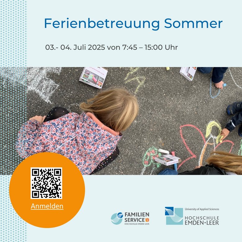 Ab sofot können Hochschulangehörige und -mitglieder Ihre schulpflichtigen Kinder bis einschließlich 12 Jahren bei unserer Ferienbetreuung für die Sommerferien anmelden. Die Anmeldephase endet am 18. Juni. Die Vergabe der Plätze geschieht anschließend nach einem Punktesystem, bei welchem z.B. Alleinerziehende oder Studierende sowie Beschäftigte der Hochschule Emden/Leer ohne andere Betreuungsoption besonders berücksichtigt werden. Eventuelle Restplätze werden bis zum Start der Ferienbetreuung weiter vergeben. Bei Zustandekommen einer Betreuung, muss für die Teilnahme des Kindes verbindlich eine Betreuungsvereinbarung unterzeichnet werden.